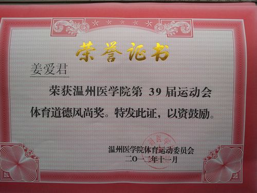姜爱君 荣获温州医学院第39届运动会体育道德风尚奖