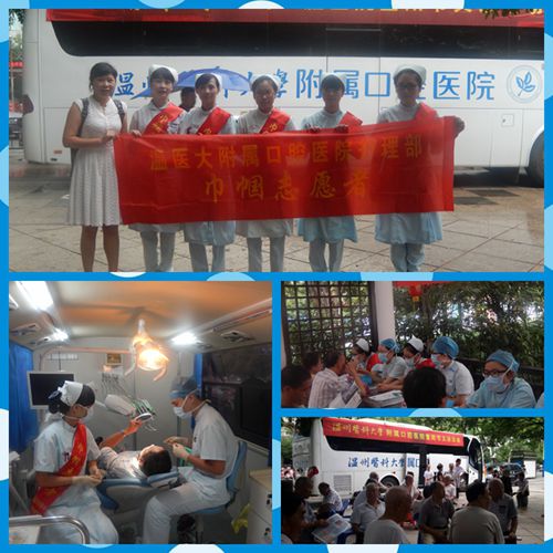 2014年9月30日下午,在九九重阳节前夕,养生有道、温州医科大学附属口腔医院联合组织了送健康进社区义诊活动,我岗岗员赵一荣、徐静、蔡玉茹、林婷婷等人协同我院医生将“流动的口腔医院”开进了温州红日亭,为在场200多位老人进行了口腔检查、口腔科普知识的宣教及常用药品的派送。