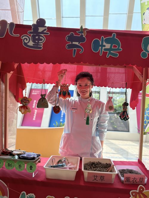 活动现场,护士姑娘们指导亲子家庭动手制作蕴含健康巧思的节日礼物。中医特制香囊体验区,家长们带着孩子仔细填充艾叶、薰衣草等天然草本,一针一线缝制出驱蚊安神的“健康守护符”,清幽药香弥漫空间。创意团扇手绘区则成为童心绽放的舞台——孩子们在素面团扇上尽情挥洒想象,绘下“方桃水木”的自然意趣,写下“儿童节快乐”“Happy”的真诚祝福,轻摇间,“风华年”的纯真与和“快乐满怀”的满足感跃然纸上。一把把“自制”的团扇,不仅是消暑良品,更承载着亲子协作的温馨记忆.